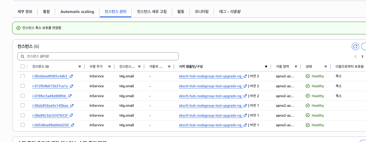 - 기존 인스턴스의 용량을 2배로 증설하고, 추가된 인스턴서의 ScaleIn Protection 후 기존 Desired Count를 기존용량으로 줄인다