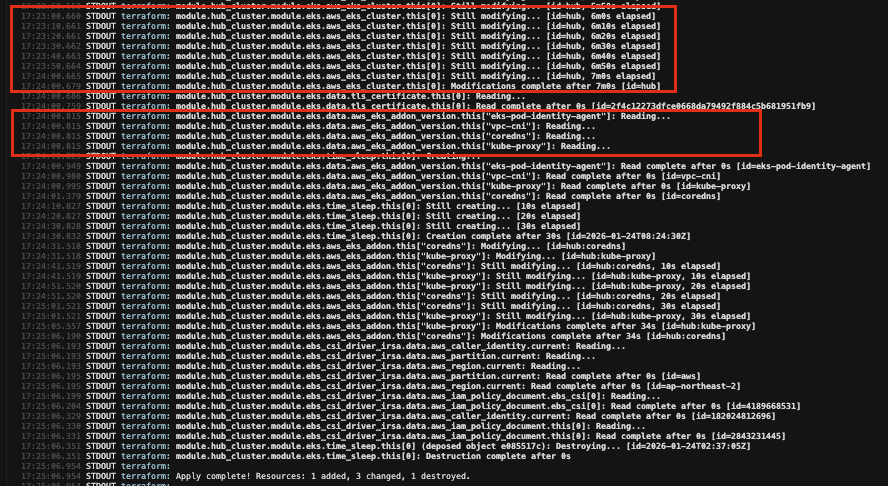 - Control Plane은 10분가량 걸림 (terarform 설정을 봐야겠지만, addons들은 버전이 안바뀌었음 -> 수동으로 설정)