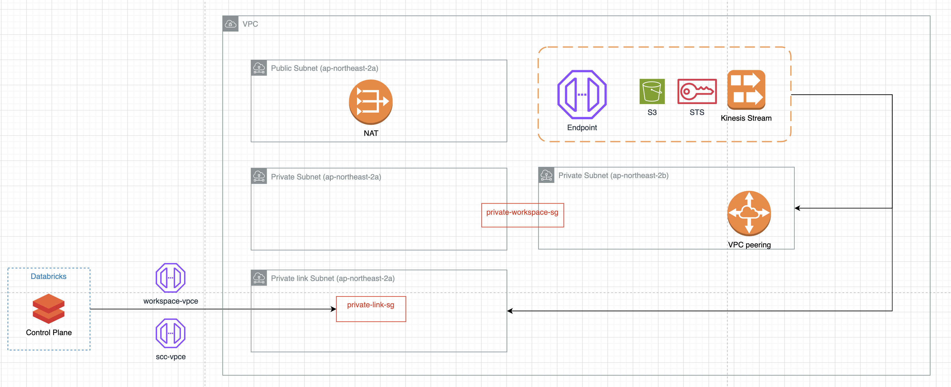 - private link subnet 부분은 databricks control plane 과 연결되는 공간이다