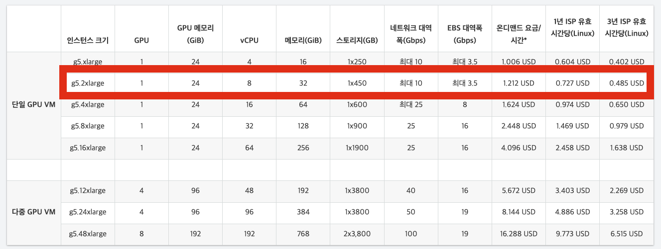 현재 회사에서 알맞은 스펙은 Amazon EC2 g5로 진행하기로 했다.