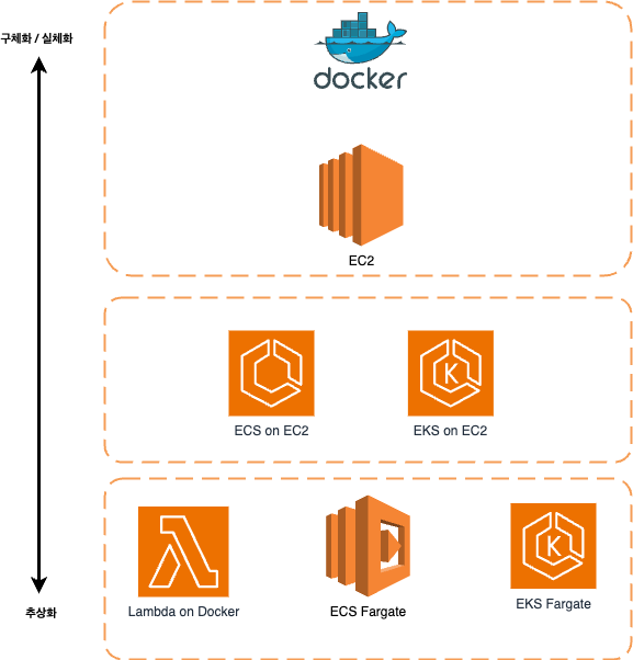 기본적인 Orchestration 을 사용하되, ECS , EKS 를 EC2를 host로 사용한다.